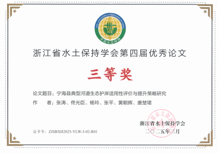 會(huì)議現(xiàn)場(chǎng)通報(bào)了2024年度生產(chǎn)建設(shè)項(xiàng)目水土保持方案優(yōu)秀單位、2024年度生產(chǎn)建設(shè)項(xiàng)目水土保持監(jiān)測(cè)優(yōu)秀單位,并為獲獎(jiǎng)集體進(jìn)行表彰。隨后,又現(xiàn)場(chǎng)表彰了浙江省水土保持學(xué)會(huì)第四屆優(yōu)秀論文評(píng)選結(jié)果。我院榮獲2024年度生產(chǎn)建設(shè)項(xiàng)目水土保持方案優(yōu)秀單位、2024年度生產(chǎn)建設(shè)項(xiàng)目水土保持監(jiān)測(cè)優(yōu)秀單位兩項(xiàng)集體榮譽(yù),并且以論文《寧??h典型河道生態(tài)護(hù)岸適用性評(píng)價(jià)與提升策略研究》獲得浙江省水土保持學(xué)會(huì)第四屆優(yōu)秀論文三等獎(jiǎng)。