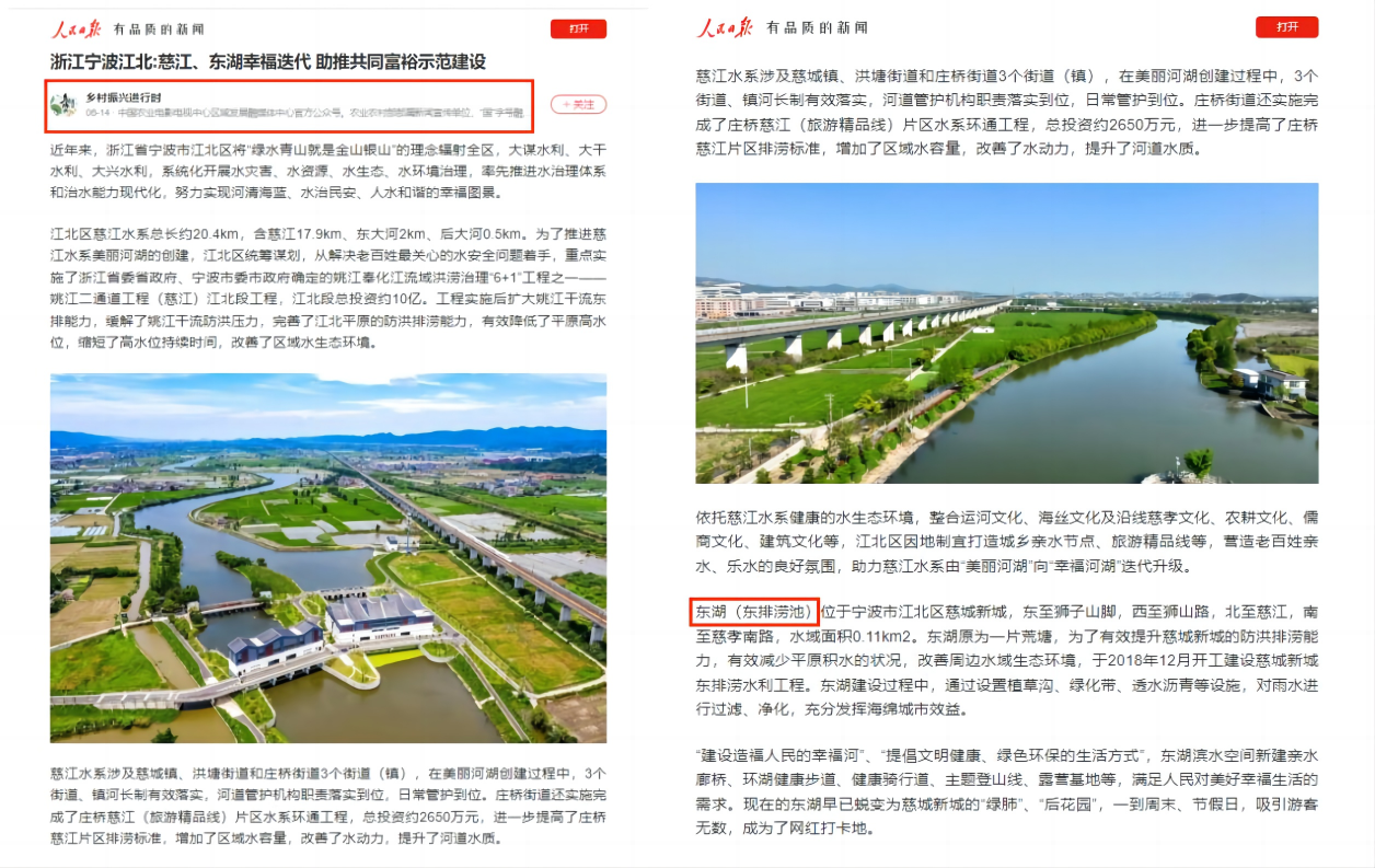 近日,由我院EPC(設(shè)計(jì)施工總承包)模式承建的慈城新城東排澇池水利工程項(xiàng)目,得到人民日?qǐng)?bào)客戶端“鄉(xiāng)村振興進(jìn)行時(shí)”的關(guān)注報(bào)道。據(jù)悉,“鄉(xiāng)村振興進(jìn)行時(shí)”是中國(guó)農(nóng)業(yè)電影電視中心區(qū)域發(fā)展融媒體中心官方公眾號(hào),農(nóng)業(yè)農(nóng)村部部屬新聞宣傳單位,“國(guó)”字號(hào)融媒體傳播機(jī)構(gòu)。(原文鏈接:https://wap.peopleapp.com/article/rmh36182554/rmh36182554)